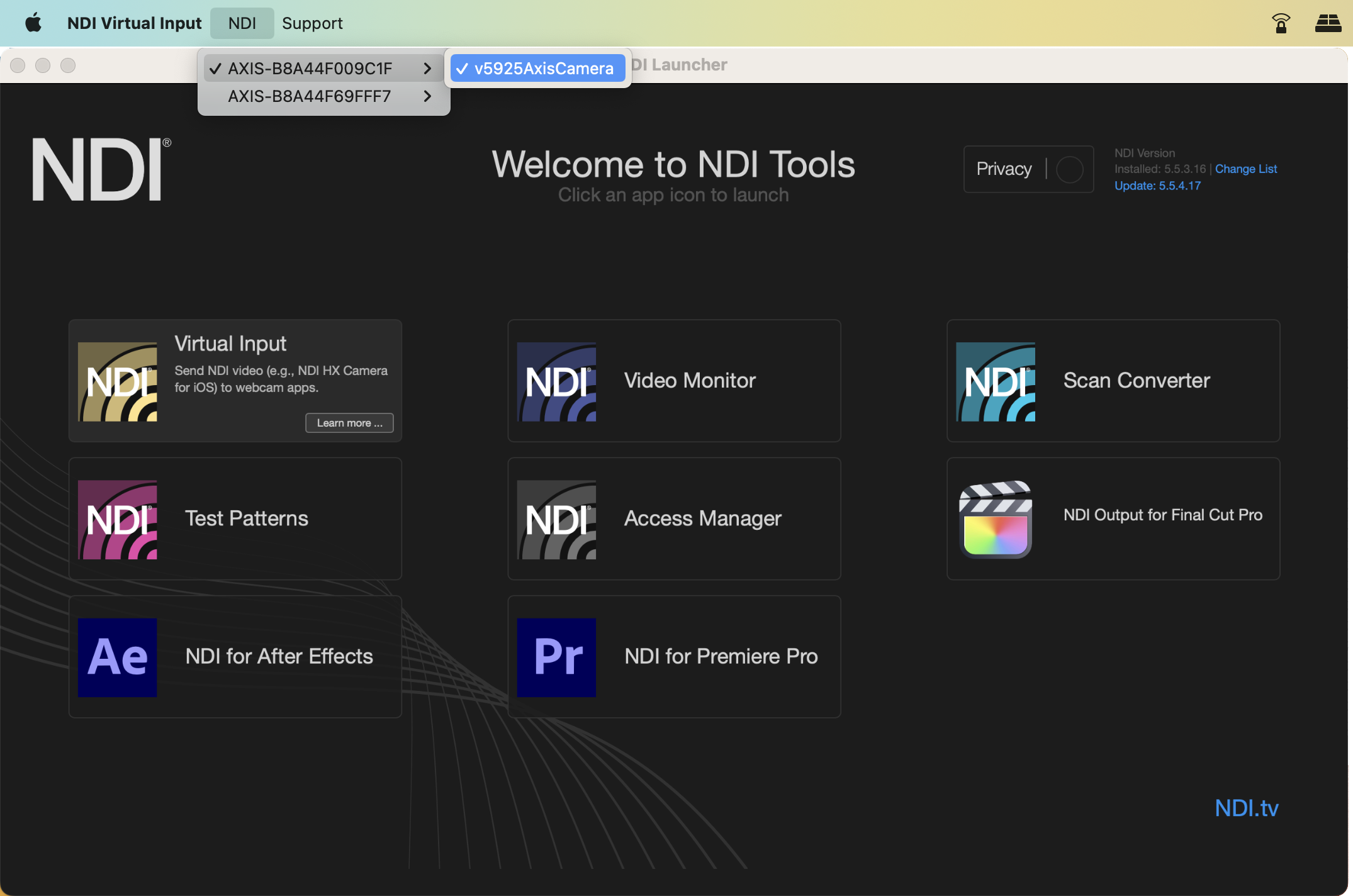 Launch the NDI Tools on your computer and select "NDI Virtual Input" (for Mac) or "NDI Webcam" (for PC). This will enable you to choose from all the Axis cameras with the NDI Plugin activated on your local network. If you're using the PC version, you can use up to four webcams simultaneously from any NDI sources.