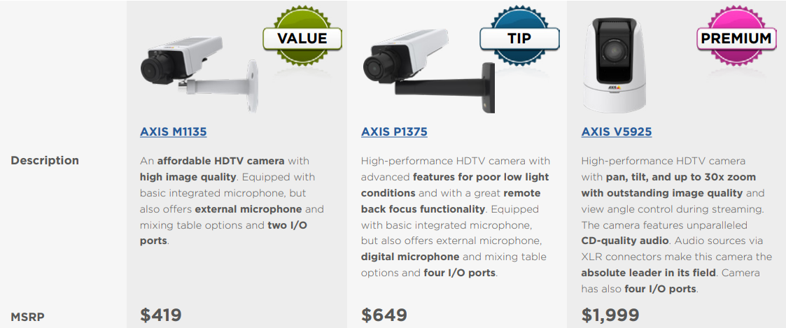 For use in places of worship, we recommend choosing from three models of network camera that we’ve successfully tested for this type of installation. For live streaming, you need to install CamStreamer App ($299)