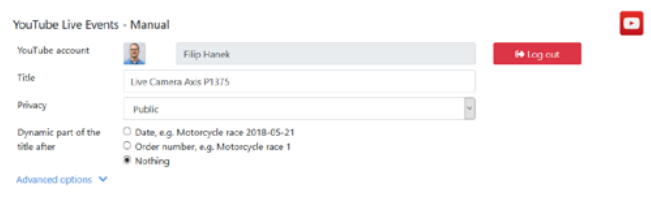 YouTube Live events Manual - Event without scheduling. You can start/stop your stream whenever you want via the user interface or via an external button connected to the camera. Event supports repeated use with starts and stops and continues to function until you delete it. It is suitable for institutions such as municipalities, churches and all timesensitive events that require manual triggering.