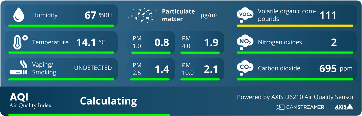 With the AXIS D6210 Air Quality Sensor and CamStreamer’s suite of applications, you can create a powerful visual communication tool that blends live video with meaningful environmental data.