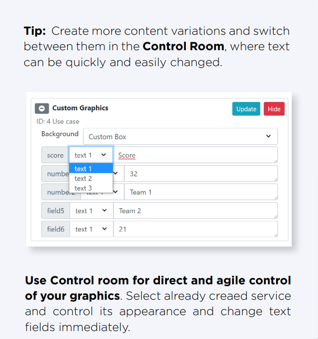 Tip: If you need to get data from an external system and display it in the graphics, the CamScripter App will help solve this task for you. This service is an interesting solution for situations such as data from results boards or for entering data from heat sensors and internal or industrial systems. Explore our website for more informations about this product!