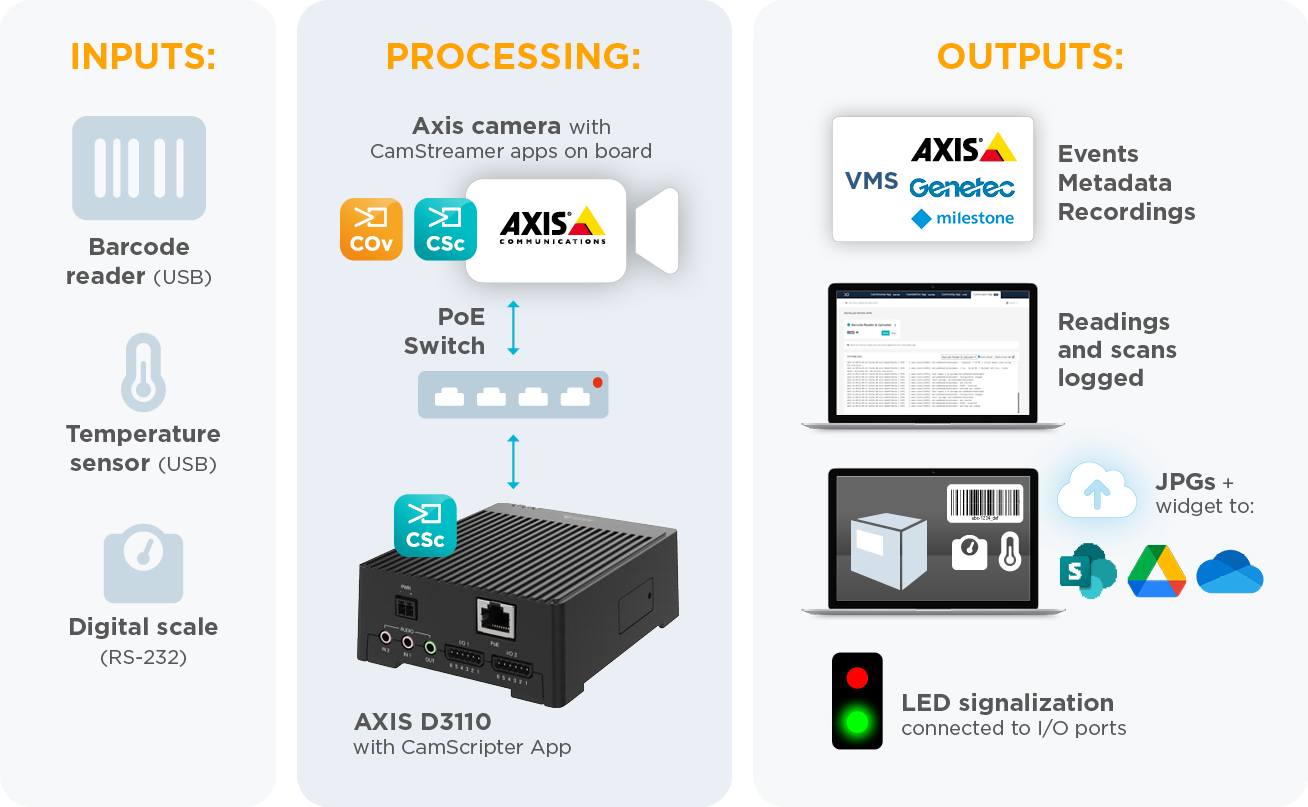 How does it work? A camera with the CamScripter App and the CamOverlay App onboard runs a script that reads data from the scale, generates overlay visuals in the video feed, creates events based on defined rules, and compiles metadata for the VMS.
