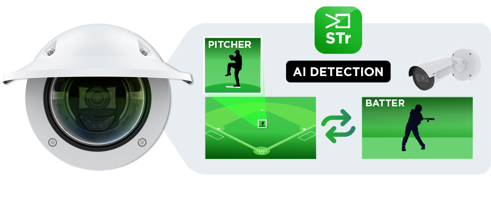 Our Sports Tracker function allows automated switching between two cameras based on AI-detection. Powered by deep learning, an AI-trained Axis camera monitors the entire field and pitcher, and detects when a pitch is thrown. At that moment, the system switches to a second camera for a close-up, frontal view of the batter.