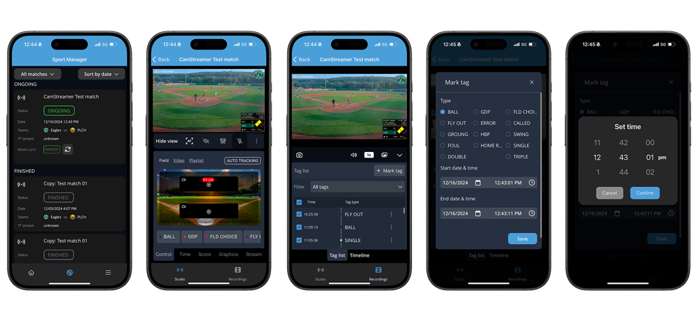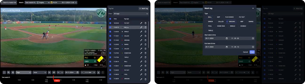 With the tagging feature, you can mark key moments in a match, making it easy to navigate and review important moments in post-match analysis or recaps. Use this feature to tag home runs, points scored, and penalties. This is ideal for coaches who want to revisit important moments. Easily export videos with these match highlights.