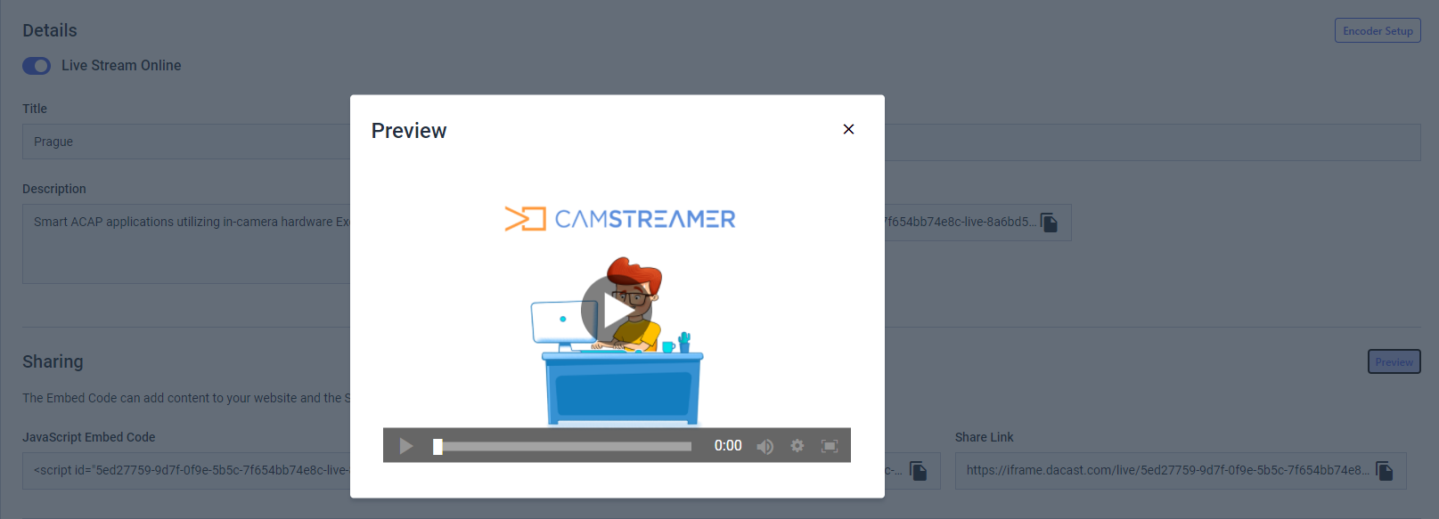 Use the Dacast online video platform for ad-free live streaming with the CamStreamer App. Dacast is a paid service which provides many advantages in comparison with free but ad-powered platforms like YouTube or Facebook. Dacast offers the possibility of a live broadcast which you can embed in websites and share on social media. By using Paywall Pay Per View, you can monetize the stream. It also provides 24/7 streaming possibilities without video length limitation or the risk of your stream being blocked due to copyright. Dacast has the tools to password protect both live video content and on-demand content and allows users to restrict access to their live streams to specific countries if needed. Setting up your live stream is simple! All you need is your Dacast login information and you can start streaming in under a minute.