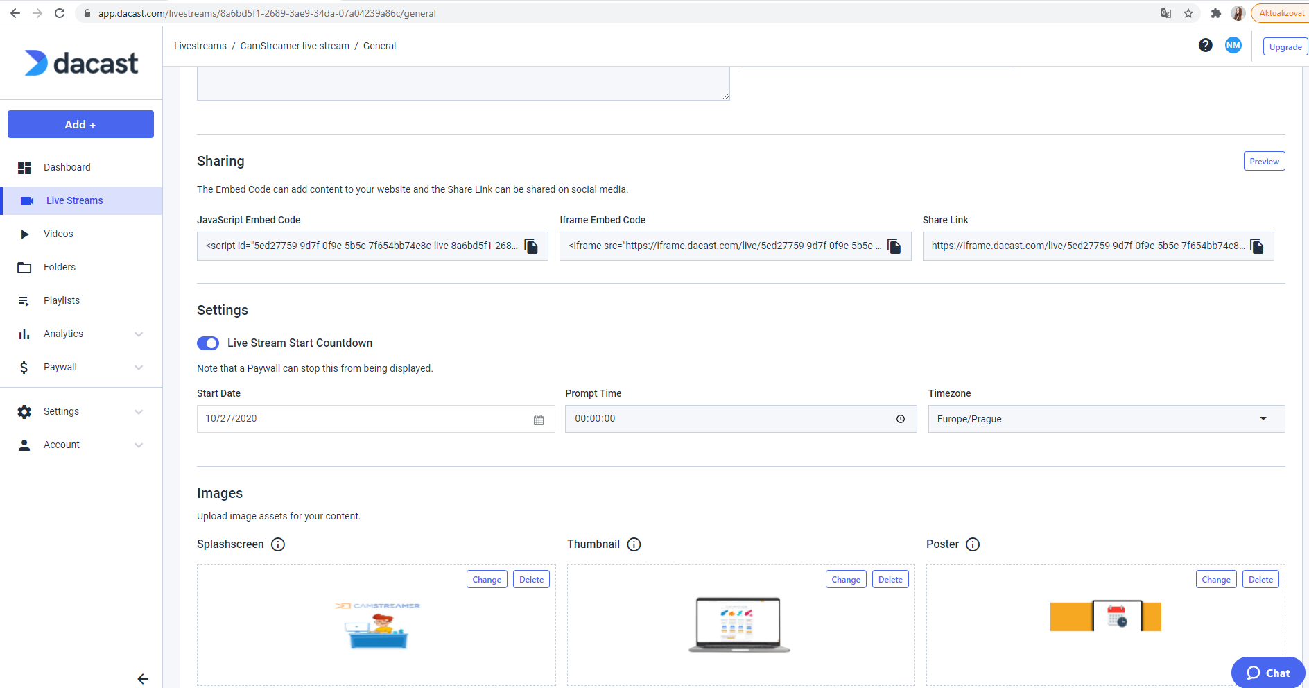 6. While setting up the stream in Dacast, you can copy links for sharing the video on websites or social media. You can also set up a countdown for the beginning of your broadcast.