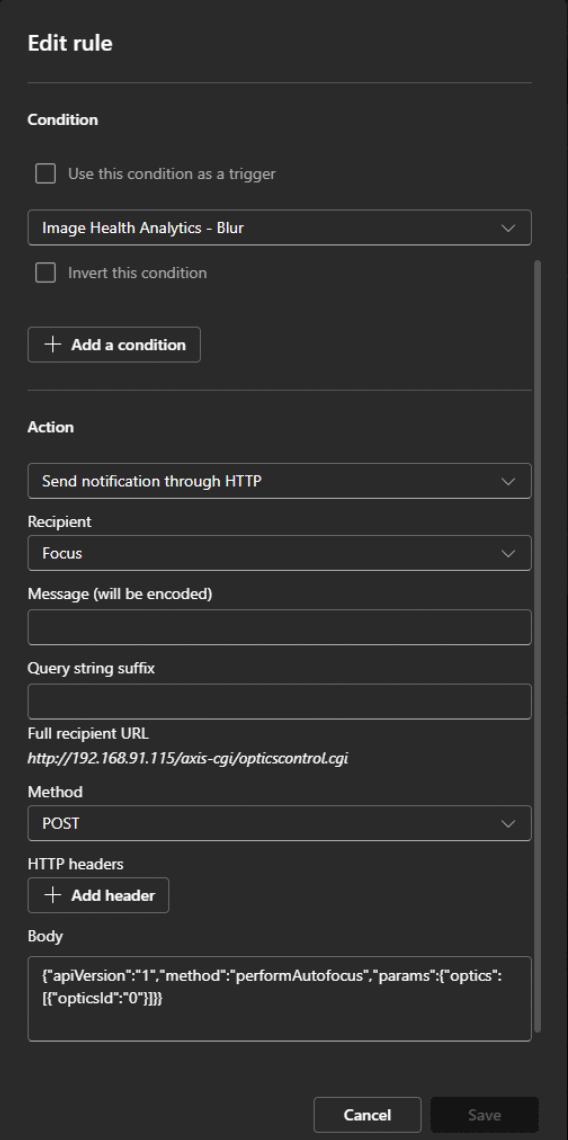 Pre-configured Axis rule initiates a VAPIX query to refocus the camera. This automated refocusing ensures that visitors can continue enjoying a seamless recording experience without manual intervention.